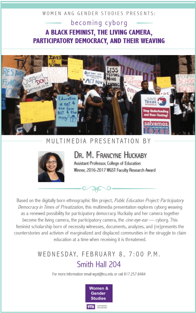 Huckaby, M.F. (February 8, 2017). becoming cyborg: Black feminist, living camera, participatory democracy & their weaving (Claudia V. Camp Faculty Research and Creative Activity Award Lecture). Fort Worth, TX: Women and Gender Studies Texas Christian University. Invited by TCU Women & gender Studies.