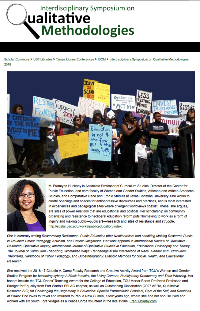 Huckaby, M. F. (March 3, 2018). Researching resistance: A Black feminist, the living camera, participatory democracy & cyborg weaving. Interdisciplinary Symposium on Qualitative Methodologies, Invited by University of South Florida Student Organization for Qualitative Methodology President, Sujay Sabnis.
